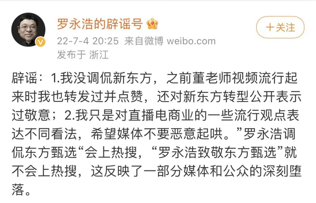 【罗永浩否认调侃东方甄选】“罗永浩的辟谣号”微博账号首次发声,否认了网上有关“罗永浩调侃东方甄选”的消息。此前有报道称,罗永浩在交个朋友直播间中表示,内容会把场观拉上去,但是对直接销售的帮助是有限的,“我们直播间40%的人进来啥也不听,直接奔购物车下单就走人”。(新京报)