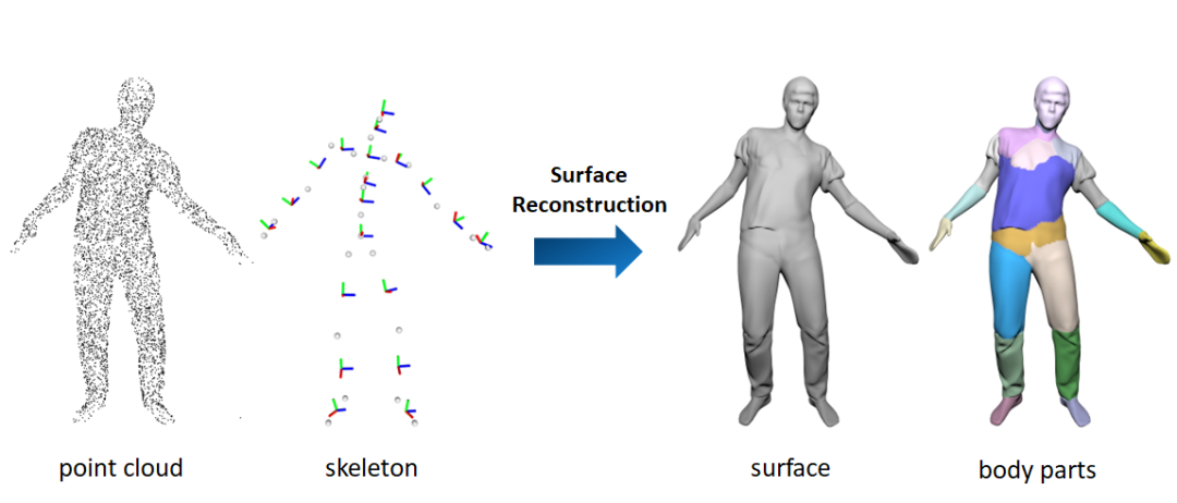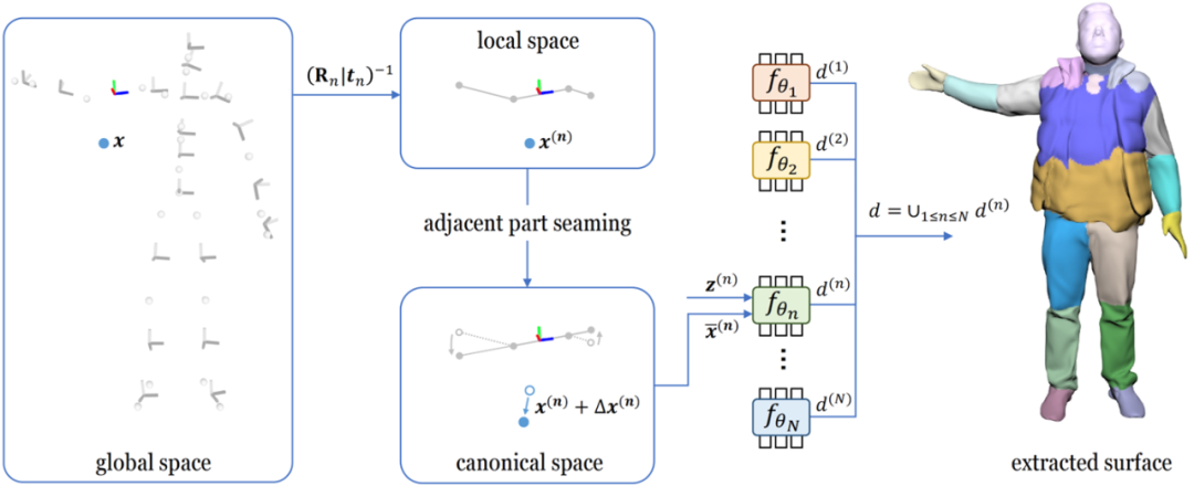 给定人体点云数据和对应的人体骨架,该方法用独立的神经网络学习人体的各个部件的有符号距离函数(SDF),并通过求并操作(Union)组合起来实现完整人体的重建。