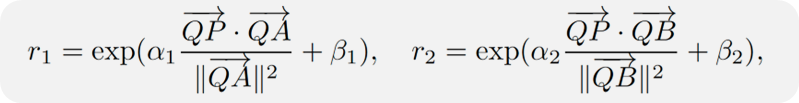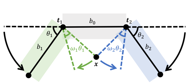 其中,Q 点将连接线 AB 按照 AO 和 BO 比例将划分为两部分。基于上式的定义,点 x 离骨骼越近,则刚度越大。α 和 β 是可优化的参数,用于建模各部件的刚度特性。