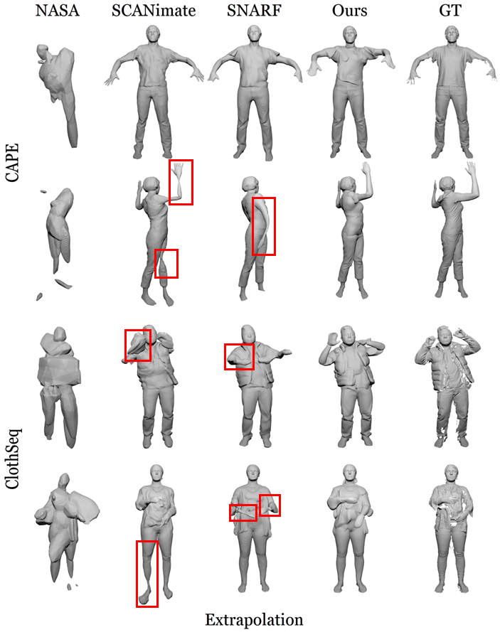 在动作外插实验中,该方法能够更好地保持形体的局部刚性,表现出更强的动作泛化能力和稳定性。