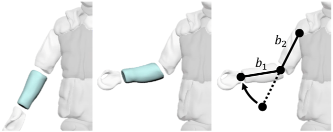 骨骼边界损失和截面法向损失:当两个部件在训练动作中几乎没有相对运动时,它们之间存在重叠的情况就无法避免。当我用新动作驱动模型时,就很容易出现暴露出原本重叠的部件,造成视觉瑕疵。作为正则项,我们提出一项骨骼边界损失旨在促使每个部件的表面穿过与它相连的关节,以及一项截面法向损失用于保证相接的部件的截面法向一致。这两项损失均是为了避免部件之间出现重叠或空缺。