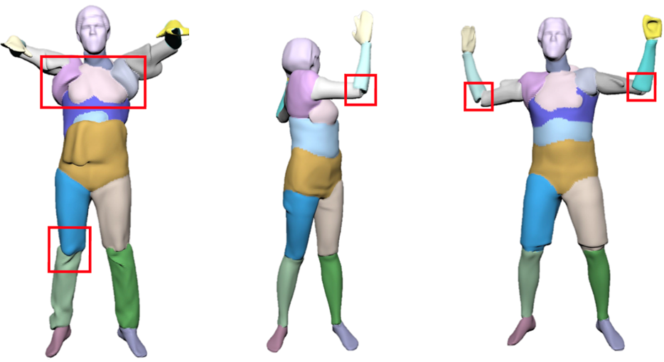 通过上述方法,该方法已经能够在训练动作下保证部件的正确划分和紧密相接。但在推广至新动作时,仍存在下图所示的断裂和重叠的问题。