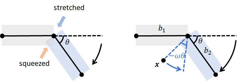 首先将空间中一点 x 随着骨骼运动的趋势定义为骨骼在该点的刚度 r,则上图中点 x 相对于骨骼和骨骼