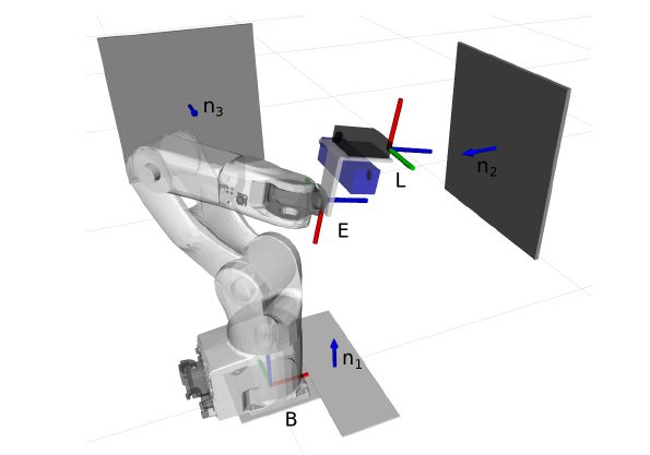 随着工业机器人被越来越多地应用于各种应用中,机器人的精度变的尤为重要,因此需要校准机器人的运动学参数和测量系统的外部参数。然而,现有的校准方法要么太麻烦,要么需要其他昂贵的外部测量系统,例如激光跟踪器或测量自旋臂。在本文中,我们提出了SCALAR,一种可以同时改善6-DoF机器人的运动学参数以及连接到机器人的2D激光测距仪(LRF)的外部参数的校准方法。在机器人周围放置三个平面,对于每个平面,机器人在其面前移动几个姿势,使得2D激光雷达的光线与相应的平面相交。然后使用几何平面约束通过Levenberg-Marquardt非线性优化算法来优化校准参数。我们通过仿真证明,SCALAR可以将机器人系统的平均位置和方向误差从14.6 mm和4.05°减小到0.09 mm和0.02°。
