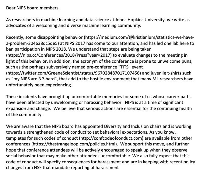 图|约翰霍普金斯大学的公开信,要求改名:应避免“NIPS”这个词产生“容易遭受性骚扰的恶劣环境”(图片来源:约翰霍普金斯大学)