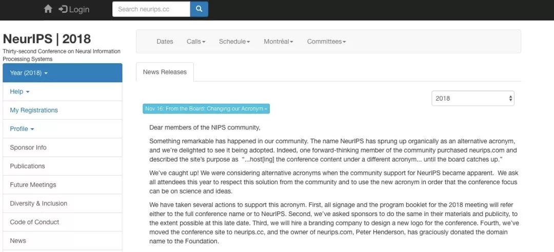 神经信息处理系统大会已经在官网公告:“我们今年要求所有与会者尊重社区的解决方案,使用新的字母缩写,以便会议重点关注科学”,“2018 年会议的所有标志和计划手册都将提及完整的会议名称或 NeurIPS”。