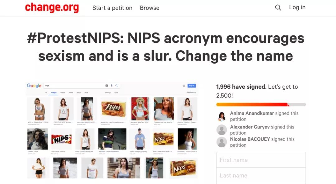 一个国际学术会议却被有心人士刻意染黄,让许多人看不下去,大声疾呼要求 NIPS 改名,今年 3 月约翰霍普金斯大学(Johns Hopkins University)超过 120 位、机器学习和数据科学领域的教授及学生向 NIPS 董事会发了一封公开信,要求改名:应避免“NIPS”这个词产生“容易遭受性骚扰的恶劣环境”。未料,10 月底 NIPS 董事会却宣布不会改名,进而引发了新一轮的抗议活动,也就是 Anima Anandkumar 发动的请愿,获得了谷歌、亚马逊、微软的知名高管及研究者响应。