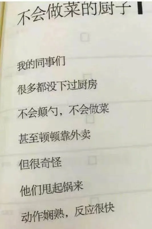 下面这一首爆火的现代诗《不会做菜的厨子》讲述了办公室中的未解之谜,不会做菜却很会甩锅,还特别会添油加醋,可能这就是职场人没有被发现的天赋。