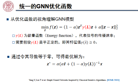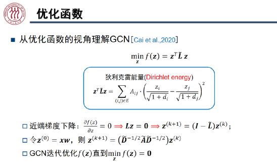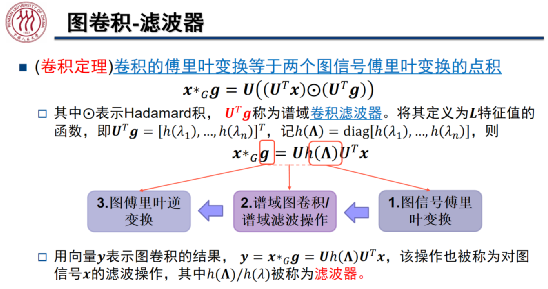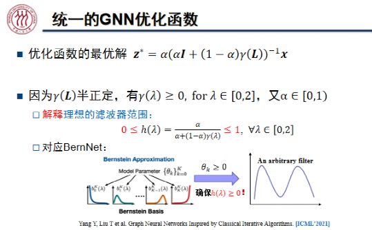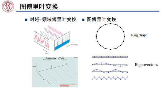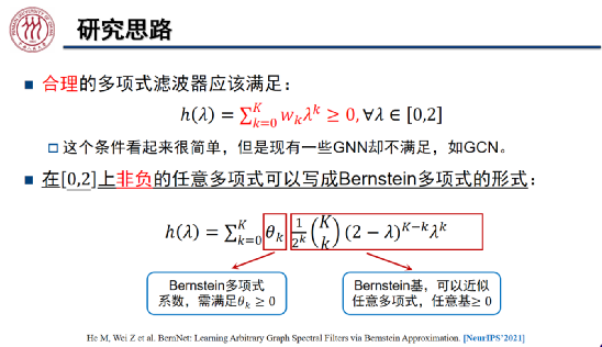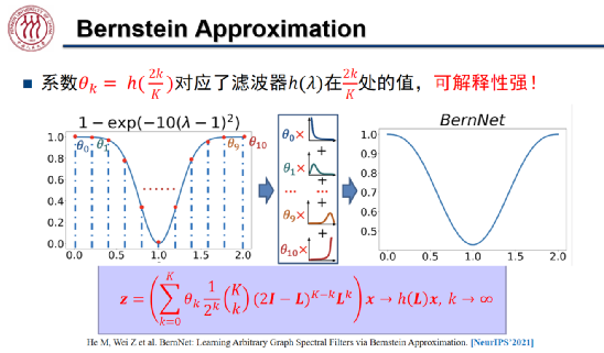我们可以用向量表示图上的信号。如上图所示,我们将地图上不同的观测点作为图中的节点,节点上的红色线段的高度代表该观测点测量到的温度,这里测量到的温度可能不准确,带有一定的噪声。从图信号处理的角度出发,我们希望通过该观测点周围的信号对其进行平滑处理,使得该观测点的温度数据更加准确。具体而言,我们将图中节点的信号与拉普拉斯矩阵 L 的函数相乘,从而将节点的信号向邻居节点传播。 我们根据拉普拉斯矩阵的特征分解将图的傅里叶变换定义为如上图所示的形式。如前文所述,拉普拉斯矩阵 L 是一个对称矩阵,我们可以将其分解为三个矩阵的乘积。其中为对角矩阵,对角线上的值为特征值,特征值的取值范围为 [0,2]。和为正交矩阵,的每一个分量为拉普拉斯矩阵 L 的特征向量,其二范数为 1。由于 L 为对称矩阵,所以的任意两个特征向量正交,即点积为零。由于和为正交矩阵,则二者乘积为单位矩阵,因此图信号的傅里叶变换和傅里叶逆变换的关系成立。 如上图所示,图信号的傅里叶变换令图上的信号左乘,相当于对笛卡尔坐标系下的图信号旋转,将其变换到由中特征向量组成的正交基坐标下。 如上图所示,传统的时域-频域上的傅里叶变换是将时域中的函数分解为不同频率的波动函数的线性组合,此时我们可以将不同频率的信号看做一组正交基。就图傅里叶变换而言,我们可以将负无穷与正无穷相连的实数轴刻画为环状图,其特征向量的频率随着特征值的增加而增加,因此小的特征值对应低频特征向量,而大的特征值对应高频特征向量。可见,图傅里叶变换是将一组空域上的图信号转换为一组波动频率逐渐升高的正交基下的坐标的变换。 在对图信号进行滤波的过程中,我们首先对图信号进行傅里叶变换,接着我们对频谱域中的特征值做滤波操作,过滤掉某些频率的信息,进而将滤波后的信号通过图傅里叶逆变换转换到原始空间中。其中,/为滤波器,当都等于 1 时,该滤波器相当于一个全通滤波器。 卷积定理指出,卷积的傅里叶变换等于两个信号傅里叶变换的点积(Hadamard 积)。为谱域的卷积滤波器,它是 L 特征值的函数。如上图所示,图上的卷操作可以写作图傅里叶变换的形式。 在节点分类任务中,滤波器起到了决定性的作用。我们将边相连的节点通常属于同一类的图称为同配图,将边相连的节点通常属于不同类的图称为异配图。低通滤波器适用于同配图的分类,高通滤波器适用于对异配图的分类。 不幸的是,处于计算开销的考量,当节点数较多时,稠密矩阵的规模过大,特征值分解的复杂度太高。为此,目前主流的图卷积神经网络算法采用多项式近似滤波器,从而降低计算复杂度。 在 ChebNet 中,作者采用切比雪夫多项式近似滤波器,其表示能力强于 GCN。如上图所示,不同颜色的曲线代表了不同阶切比雪夫多项式对应的基,随着多项式阶数上升,其频率越来越高,这与图傅里叶变换类似。 ChebNet 在一些半监督任务上的效果欠佳。为此,Kipf 等人于 2017 年提出 GCN,简化了 ChebNet,只使用了前两阶的切比雪夫多项式,并且通过加入自环进行了重归一化。然而,该模型在进行节点分类时,只能使用两层 GCN,即利用 2 以内的邻居信息。 以低通滤波器为例,单层 GCN 低通滤波器可以线性地保留低频信号,过滤高频信号。但是,随着 GCN 层数 K 上升,滤波器会越来越平滑,在 K 极大的情况下几乎只允许最低频的信号通过。 此外,研究者们尝试使用各种各样的多项式学习滤波器。以 ICLR 2021 上发表的论文 GPR-GNN 为例,作者利用了 Monomial 学习多项式系数。大于等于零时,该网络相当于低通滤波器;时,该网络相当于高通滤波器。然而,该架构缺乏可解释性,不能解释学到的任意滤波器。 BernNet: Learning Arbitrary Graph Spectral Filters via Bernstein Approximation(NeurIPS, 2021) 在 NeurIPS 2021 上,魏哲巍教授团队提出了 BernNet,该架构可以学习/设计任意的谱滤波器。如前文所述,特征值,合理的多项式滤波器。若小于零,图神经网络的滤波结果会随着层数的奇偶变化震荡。然而,GCN 等图神经网络并不满足上述条件。 魏哲巍教授团队发现,在谱域上,区间内非负的任意多项式可以写成 Bernstein 多项式的形式,该多项式的系数,我们可以用一组 Bernstein 基线性近似任意多项式,从而学习任意的滤波器。受此启发,我们将 BernNet 模型定义为: Bernstein 多项式为 BernNet 带来了很强的可解释性,其中对应滤波器在处的函数值。如上图所示,假设滤波器函数为拒绝中频信号的,我们将[0,2]均匀分成 k 分,将「0」、「2」及每个分位数对应的定义为系数。我们将这组系数与对应的伯恩斯坦多项式线性组合起来就得到了右侧 BernNet 的曲线。为了保证,我们只需将重参数化为,从而保证该滤波器的值恒大于等于零。这样一来,我们就可以学习任意的滤波器,且拟合精度随着 k 的增加而提升。