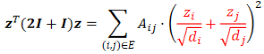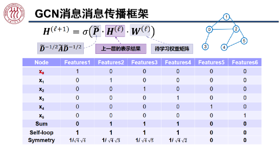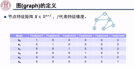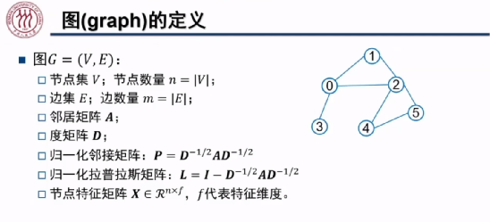在现实生活中,图数据无处不在。例如,在社交网络中,可以将用户作为节点,好友关系、转发关系、点赞关系作为图中的边;在论文引用网络中,论文为节点,引用关系为边;在通讯信号网络中,信号基站、手机为节点,边的权重为节点之间的信号强度。 在无向图中,我们将节点集合定义为 V,其节点个数为 n;边集为 E,其节点个数为 m。若节点 i 和节点 j 之间存在连接关系(边),则邻接矩阵 A 中对应的元素值为 1,否则该元素的值为 0, A 为一个对称矩阵。ji矩阵 D 为一个对角矩阵,第 i 行对角线上的元素为节点 i 的邻居节点的数量。归一化后的邻接矩阵 P 为邻接矩阵 A 分别左乘、右乘,其中对角矩阵对角线上的元素为度矩阵 D 对角线上每个对应元素开根号、取倒数后的结果。归一化后的拉普拉斯矩阵为单位矩阵 I 与归一化后的邻接矩阵 P 之差。 除了刻画图结构信息的矩阵之外,我们将刻画每个节点特征信息的矩阵记为,其中 n 为节点个数,f 为特征维度。例如,上图中六个节点的特征分别为一个维数为六的 one-hot 向量。