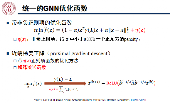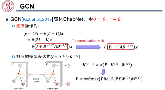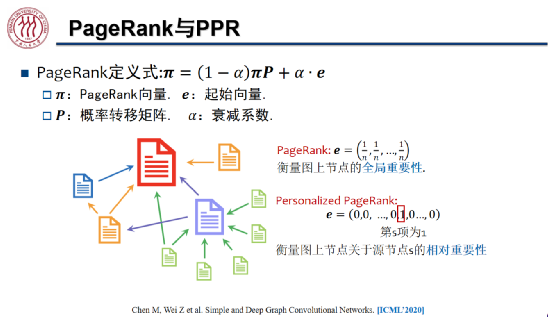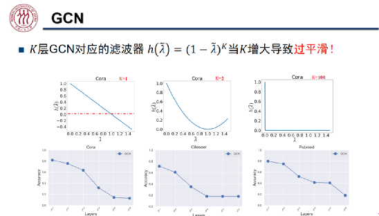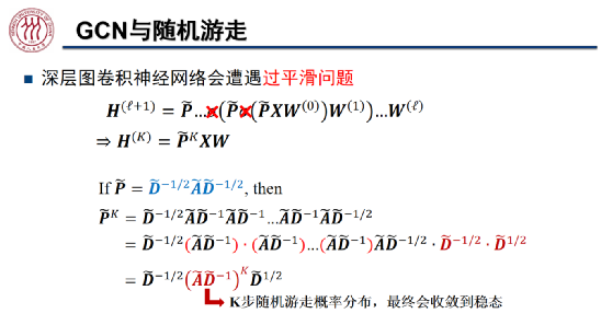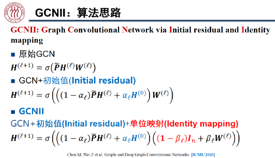 在随机游走的马尔科夫过程中,我们在每一步上从某节点以相等的概率走向该节点的某个相邻节点,概率转移矩阵记为。大部分随机游走过程会收敛到某个稳态上,即。在无向图上,节点 v 处的稳态为,即 v 点的度除以两倍的图中边总数。可见,稳态分布与随机游走的起始节点无关。我们可以通过 Cheeger 不等式刻画在随机游走中收敛的速度,该不等式也可以被用于社区发现: 其中为从节点 u 开始的第 K 步随机游走,为拉普拉斯矩阵最小的非零特征值。 我们可以通过随机游走解释 GCN 的过平滑现象。如上图所示,在去掉激活函数后,第 K 层的图表示结果为,将归一化后的邻接矩阵展开后,可得。其中为 K 步随机游走后的概率分布,随着 K 的增大会收敛到稳态。也就是说,最终的图表示只与图的结构相关,与随机游走初始节点无关。随着图卷积网络层数加深,网络会逐渐「忘记」初始特征,出现过平滑现象,导致节点分类效果较差。 一些研究者曾试图通过加入残差连接(自环)解决过平滑,但该操作并不能奏效,因为该情况下的随机游走是一个速率较慢的 Lazy 随机游走,但仍然会收敛到稳态。Oono 和 Suzuki 等人于 ICLR 2020 发表的论文指出,当加入激活函数时,图神经网络收敛到稳态的速度乘指数形式,其收敛速度由图的拓扑结构决定。 GCNII:Simple and Deep Graph Convolutional Networks(ICML, 2020) 如上图所示,为了解决 GCN 存在的过平滑问题,魏哲巍教授团队通过初始值残差连接在每一层的图表示上加上初始特征,并且向每一层的权重中加入了单位映射,从而更多地保留了上一层的表示。 通过加入初始值残差,我们实现了「带重启」的随机游走,随机游走在每一步上有的概率返回初始状态,有的概率随机走向当前节点的任一邻居,此时稳态的分布就与起始节点有关了。这种随机游走与 PageRank 算法使用的方法类似。 受到马腾宇博士论文「Identity Matters in Deep Learning」的启发,我们向待学习的权重矩阵加入了单位矩阵,有效提升了模型的泛化能力。