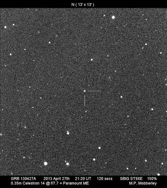 由费米伽玛射线空间望远镜和雨燕卫星在2013年4月27日探测到的迄今最强的伽玛射线暴(未归算红移)。 这次伽玛射线暴位于狮子座方向,其中单个光子的最高能量至少为940亿电子伏(94 TeV),距离地球约36亿光年,是已知最近的五个伽玛射线暴之一,同时也是持续时间相对较长的一次伽玛射线暴。