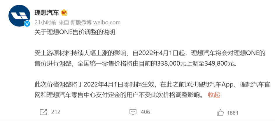 据理想汽车官微消息,自4月1日起,理想汽车将会对理想ONE的售价进行调整,全国统一零售价格将由目前的338000元上调至349800元,之前已经支付定金的用户不受影响。