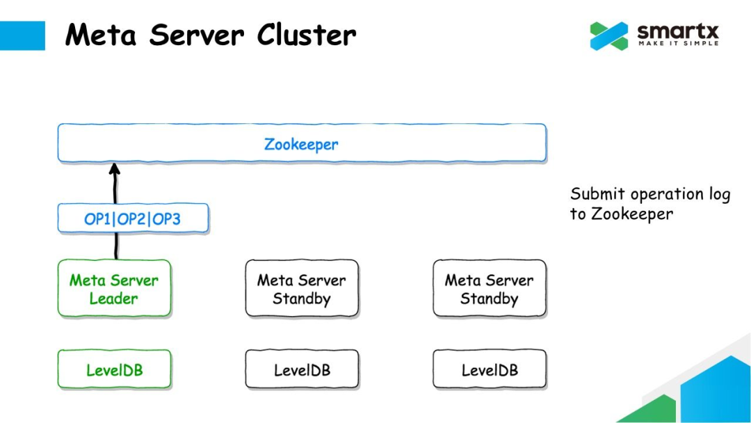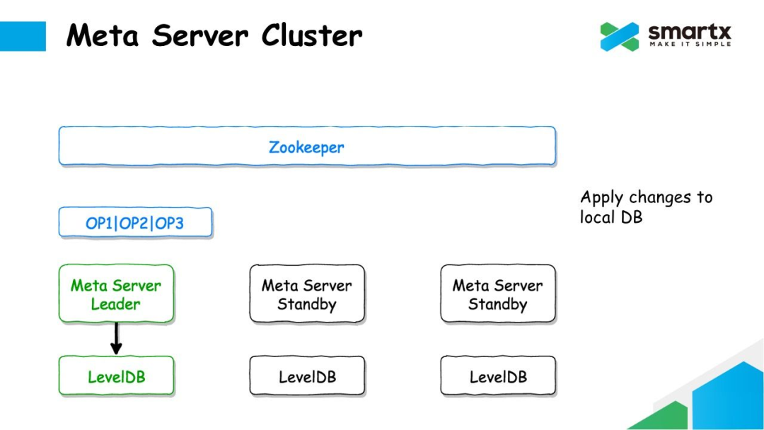 对于非 Leader 的 Meta Server 节点,会异步的从 Zookeeper 中拉取 Log,并将通过反序列化,将 Log 转换成对元数据的操作,再将这些修改操作提交到本地的 LevelDB 中。这样就能保证每一个 Meta Server 都可以保存一个完整的元数据。