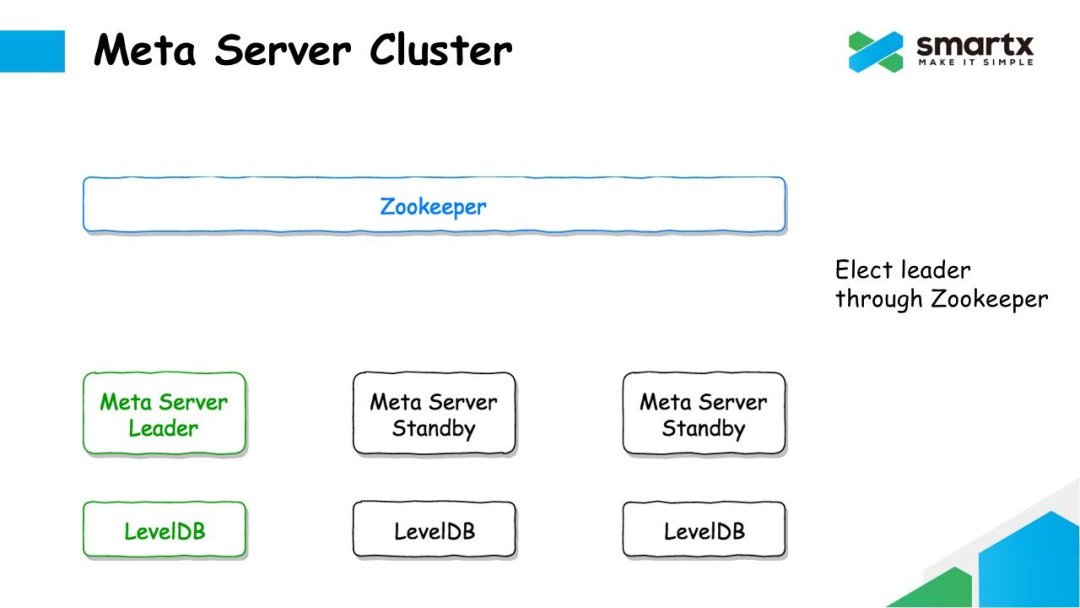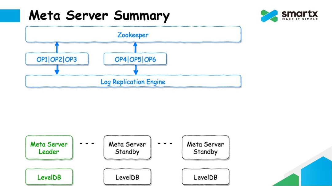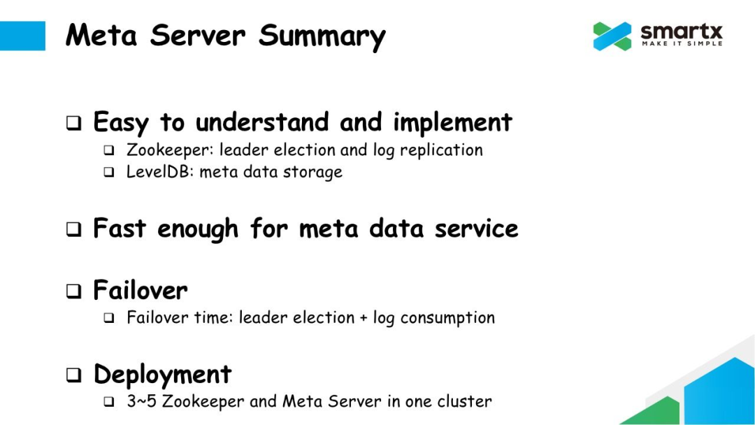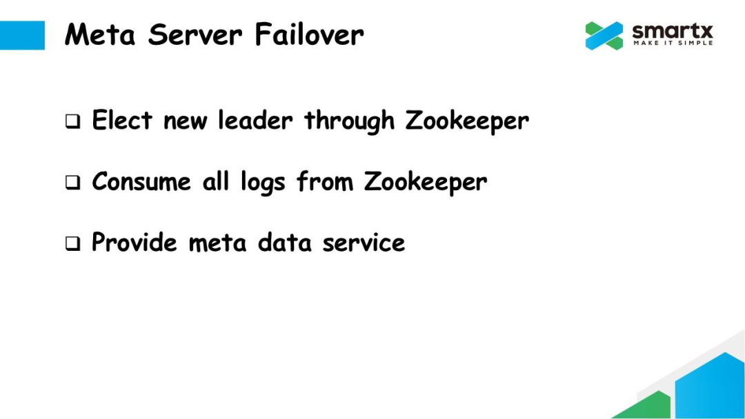 Failover 的逻辑也非常简单。如果 Leader 节点发生故障,其他还存活的的 Meta Server 通过 Zookeeper 再重新进行一次选主,选出一个新的 Meta Leader。这个新的 Leader 将首先从 Zookeeper 上同步所有还未消耗的日志,并在提交到本地的 LevelDB 中,然后就可以对外提供元数据服务了。