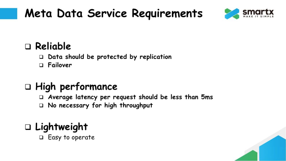 最后一个需求是轻量级。由于我们产品大部分使用场景是私有部署,也就是我们的产品是部署在客户的数据中心的,且由客户自己运维,而非我们的运维人员运维。这个场景和很多互联网公司自己来运维自己的产品是完全不同的场景。所以对于 ZBS 来说,我们更强调整个系统,尤其是元数据服务的轻量级,以及易运维的能力。我们期望元数据服务可以轻量级到可以把元数据服务和数据服务混合部署在一起。同时我们希望大部分的运维操作都可以由程序自动完成,或用户只需要在界面上进行简单的操作就可以完成。