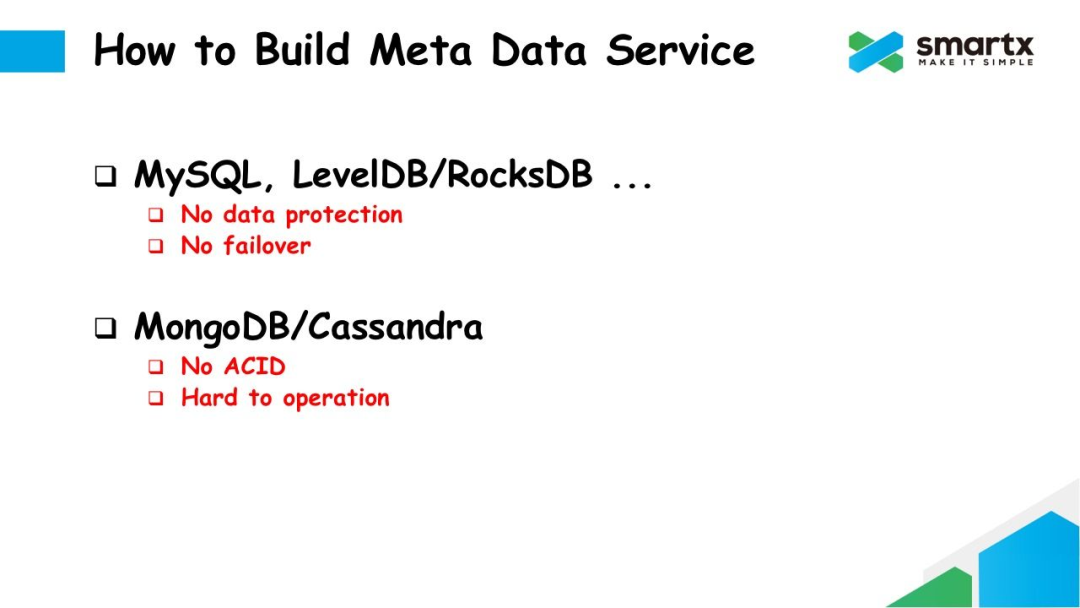第四种是选择 Zookeeper。Zookeeper 基于 ZAB 协议,可以提供一个稳定可靠地分布式存储服务。但 Zookeeper 的最大的问题是能够存储的数据容量非常有限。为了提高访问速度,Zookeeper 把存储的所有数据都缓存在内存中,所以这种方案导致元数据服务所能支撑的数据规模严重受限于服务器的内存容量,使得元数据服务无法做到轻量级,也无法和数据服务混合部署在一起。