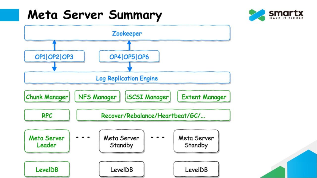 我们具体来看一下 ZBS 是如何利用 Zookeeper + LevelDB 完成 Log Replication 操作的。首先,集群中有很多个 Meta Server,每个 Server 本地运行了一个 LevelDB 数据库。Meta Server 通过 Zookeeper 进行选主,选出一个 Leader 节点对外响应元数据请求,其他的 Meta Server 则进入 Standby 状态。