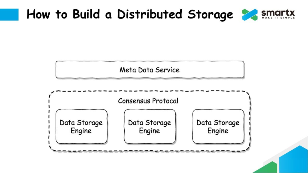 从广泛意义上讲,分布式存储中通常需要解决三个问题,分别是元数据服务,数据存储引擎,以及一致性协议。