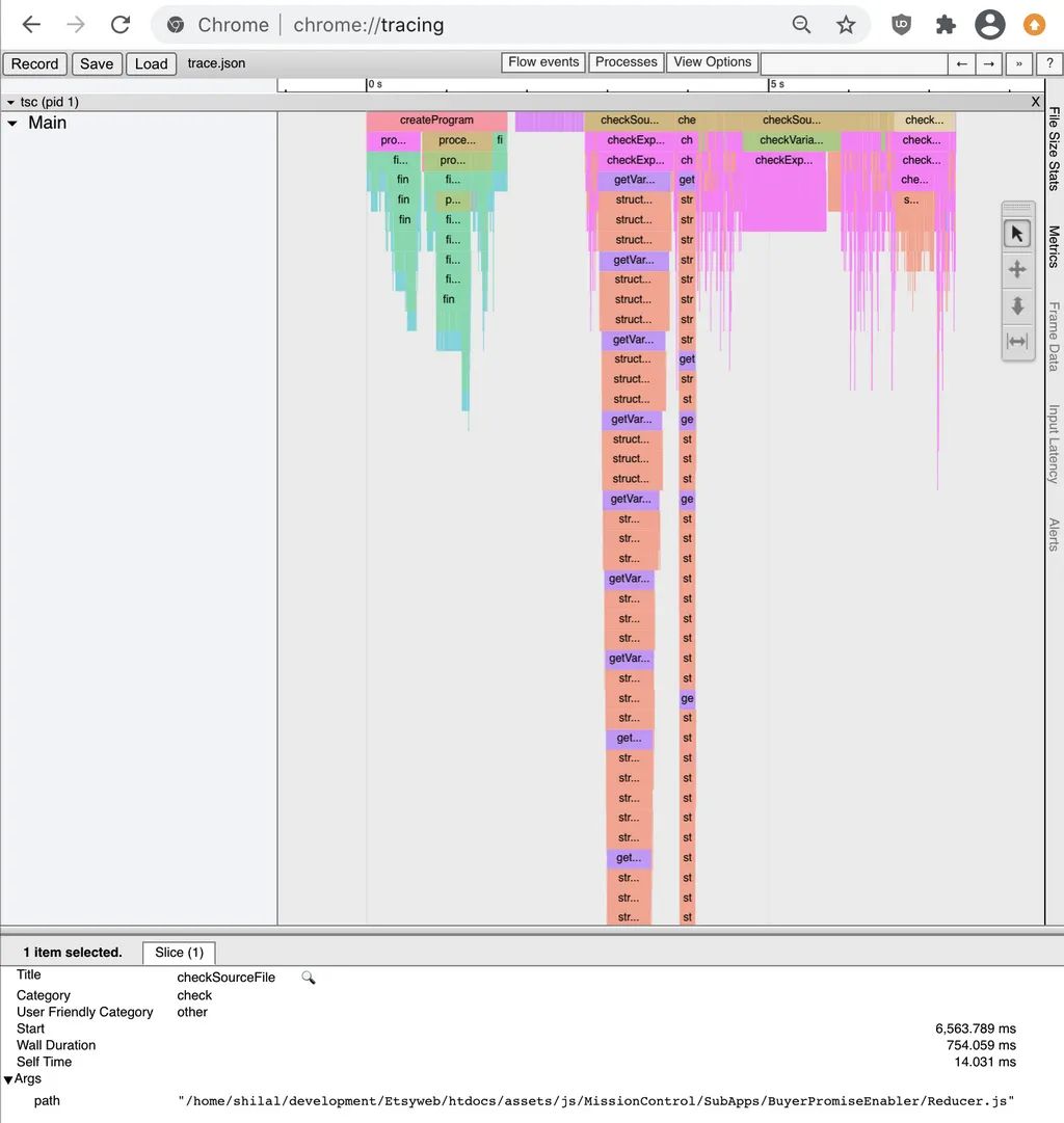 在反复讨论后,确定我们没有包含超出需求的文件后,他们向我们展示了当时他们刚刚推出的性能跟踪功能。跟踪结果表明,当对未迁移的 JavaScript 文件进行类型检查时,TypeScript 就会对我们的一个类型出现问题。以下是该文件的跟踪(这里的宽度代表时间)。