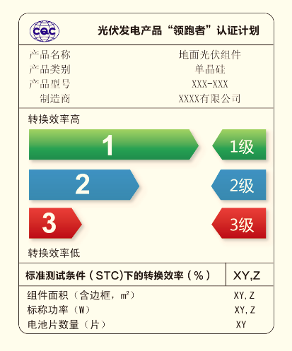 如光伏组件和光伏逆变器的发电效率指标分为3级,如图4所示,以“1级”代表最高效,为“平价先锋”产品,“2级”代表满足行业先进技术指标要求,为“领跑者”产品,“3级”代表最低效,只满足准入要求。针对光伏逆变器的应用环境特点,依据CQC3318-2015《光伏逆变器特定环境技术要求》,针对特定应用环境下的低温工作、高温工作、交变湿热、振动、冲击、盐雾多重环境综合影响,设定了六类不同严苛程度的特定环境测试序列。“领跑者”认证是一个拔高的认证,业主单位可根据光伏产品的使用场景、投资模型选取相应的“领跑者”产品。