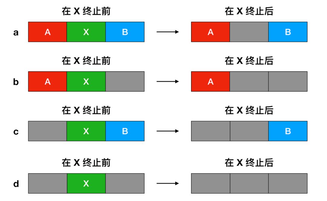 在这个例子中,段链表(segment list)是按照地址排序的。这种方式的优点是,当进程终止或被交换时,更新列表很简单。一个终止进程通常有两个邻居(除了内存的顶部和底部外)。相邻的可能是进程也可能是空闲区,它们有四种组合方式。