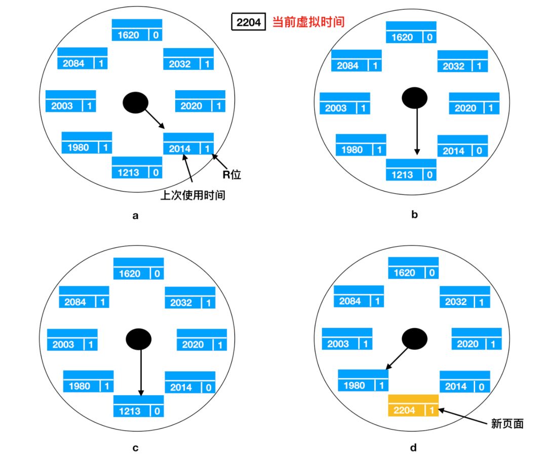 当缺页错误出现时,算法首先检查表针指向的页面,如果它的 R 位是 0 就淘汰该页面,并把新的页面插入到这个位置,然后把表针向前移动一位;如果 R 位是 1 就清除 R 位并把表针前移一个位置。重复这个过程直到找到了一个 R 位为 0 的页面位置。了解这个算法的工作方式,就明白为什么它被称为 时钟(clokc)算法了。