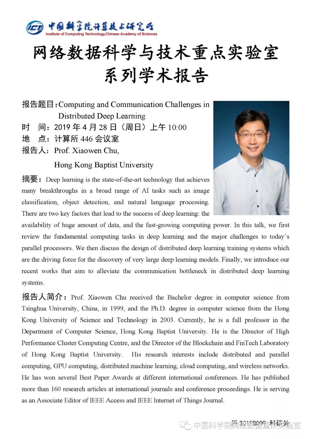 实验室邀请到了香港浸会大学褚晓文教授到实验室交流访问, 于4月28日上午10:00在计算所446会议室给大家做学术报告,报告题目为