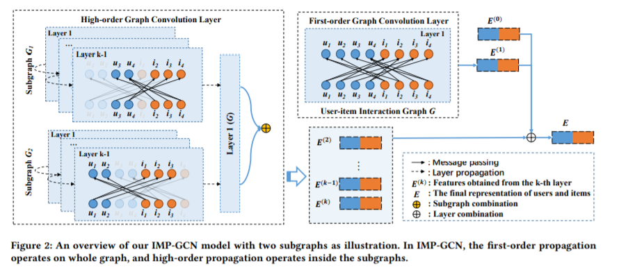 图卷积网络(GCNs)在推荐方面表现出巨大的潜力。这归功于他们通过利用来自高阶邻居的协作信号来学习良好的用户和项目嵌入的能力。与其他GCN模型一样,基于GCN的推荐模型也存在着臭名昭著的过平滑问题——当叠加更多层时,节点嵌入变得更加相似,最终无法区分,导致性能下降。最近提出的LightGCN和LR-GCN在一定程度上缓解了这一问题,但是我们认为他们忽略了推荐中出现过平滑问题的一个重要因素,即在图卷积操作中,用户的嵌入学习也可以涉及到与用户没有共同兴趣的高阶邻域用户。因此,多层图卷积会使不同兴趣的用户具有相似的嵌入性。在本文中,我们提出了一种新的兴趣感知消息传递GCN (IMP-GCN)推荐模型,该模型在子图中进行高阶图卷积。子图由具有相似兴趣的用户及其交互项组成。为了形成子图,我们设计了一个无监督的子图生成模块,该模块利用用户特征和图结构来有效识别具有共同兴趣的用户。为此,我们的模型可以避免将高阶邻域的负面信息传播到嵌入学习中。在三个大规模基准数据集上的实验结果表明,我们的模型可以通过叠加更多的层来获得性能的提高,显著优于目前最先进的基于GCN的推荐模型。