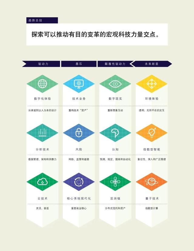 当今的颠覆性驱动力(即数字现实、认知技术和区块链)都是由体验、分析技术和云技术发展而来。未 来十年,这些新的趋势虽然不再新鲜,但它们将和过往的重大趋势一样,在人们持续深刻的理解和应用 中,推动重要的变革。