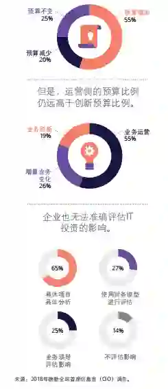 根据德勤《 2018 年全球首席信息官(CIO)调查报 告》,65% 的受访者表示他们在评估 IT 投资时, 通常采用具体案例具体分析的方法,而不是遵循常规财报流程。显然,在评估 IT 带来的价值这件事上,首席信息官 (CIO )与首席财务官 (CFO)不在同一立场。