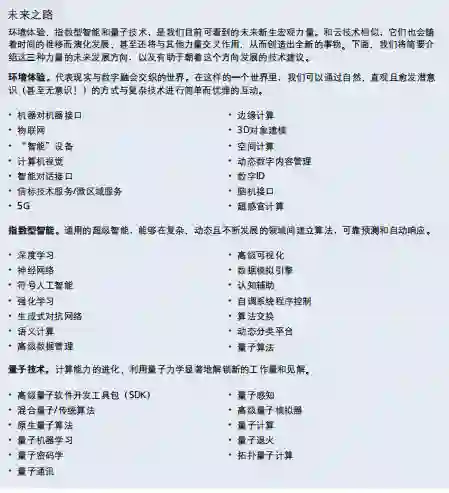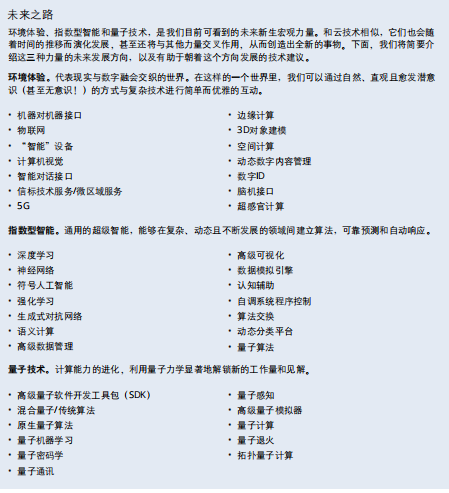 随着三大颠覆性技术(即数字现实、认知技术和区块链)崛起,并准备在未来十年为业务做出重大贡献 的同时,未来三大技术发展和创新的新星(环境体验、指数型智能和量子技术)正蓄势待发。我们将在 本世纪 20 年代末开始感受到它们的影响。
