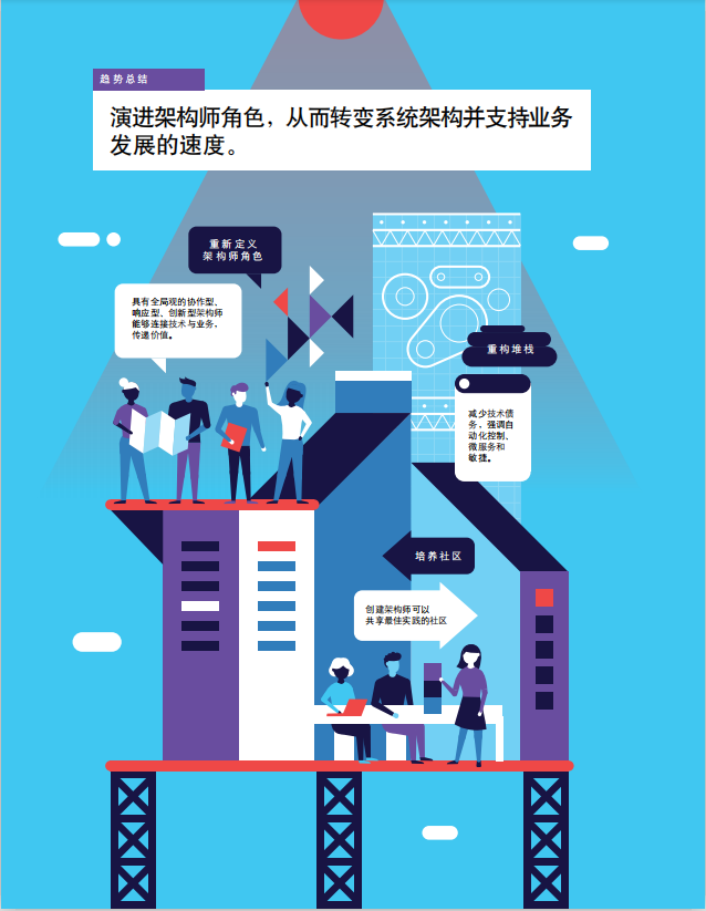 此外,拥抱架构觉醒这一趋势的企业将开始重新定义架构师角色,使其更具协作性、创新性,并能对利益相关者的需求做出回应。具有全局观的架构师可能会发现,自己正在多部 门混合的项目团队中,与专注于应用程序的架构师 以及来自 1T 和业务部门的同事共同作战。未来,他们的使命将不仅是利用传统的架构组件,还要利用颠覆性力量(如区块链、AI、及机器学习)大胆创新。