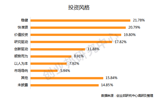 调研数据显示,参评投资人的投资风格自评中,稳健投资排首位,占比21.78%;20.79%的投资人倾向于快速寻找项目、精准分析并敢于承担一定风险押注;19.80%的投资人则表示看重企业的发展潜力和未来长期价值,与企业共同成长。
