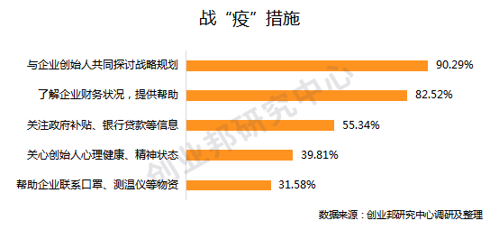 调研数据显示,90.29%的参评投资人都在积极和被投企业进行战略规划研讨,对风险进行梳理把控。其中,现金流的重要性再度被强调——82.52%的参评投资人会尽早了解被投企业的财务状况,未雨绸缪,对症下药;55.34%的参评投资人帮助企业对接银行等机构,以便获得短期低息贷款;部分投资人会关心创始团队的的身心健康、提供抗疫情物资等。