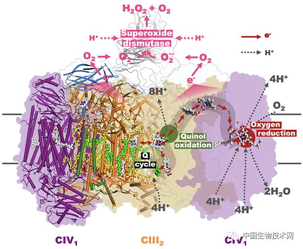 饶子和院士团队的这项工作基于分枝杆菌能量代谢系统呼吸链超级复合物的高分辨率(3.5 Å)冷冻电镜结构,揭示了生命体内一种新的醌氧化与氧还原相偶联的电子传递机制。同时,也是首次通过结构生物学的研究,发现超氧化物歧化酶(superoxide dismutase, SOD)直接参与呼吸链系统氧化还原酶超级复合物的组装,并协同工作的现象。
