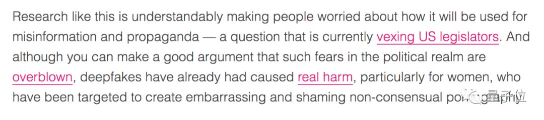 这样的研究总让人们担忧,怕它会被用在谣言和政治宣传上,实在是让美国立法者们伤脑筋。当然,你也可以说这种在政治领域的威胁没那么严重,但deepfakes已经确确实实伤害了一些人,尤其是女性,在未经同意的情况下被用来制造了又难堪又羞辱的色情视频。