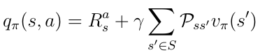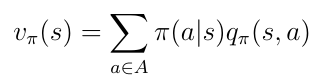 在这个例子中处于状态 s 允许我们采取两种可能的动作 a 。 根据定义,在特定状态下采取特定动作会给我们动作值q(s,a)。 值函数v(s)是在状态 s(等式16)中采取动作a的概率加权的可能q(s,a)的总和(其不是策略 π 除外)。