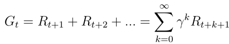 感兴趣的主要话题是总奖励Gt(等式5),它是主体将在所有状态的序列中获得的预期累积奖励。 每个奖励都由所谓的折扣因子γ∈[0,1]加权。 折扣奖励在数学上是方便的,因为它避免了循环马尔可夫过程中的无限回报。 除了折扣因素意味着我们未来越多,奖励变得越不重要,因为未来往往是不确定的。 如果奖励是金融奖励,立即奖励可能比延迟奖励获得更多利息。 除了动物/人类行为表明喜欢立即奖励。
