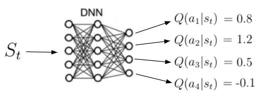除状态-价值函数之外的另一个重要功能是所谓的动作-价值函数q(s,a)(等式13)。 动作-价值函数是我们通过从状态s开始,采取行动 a 然后遵循策略 π 获得的预期回报。 请注意,对于状态s,q(s,a)可以采用多个值,因为主体可以在状态s中执行多个操作。 Q(s,a)的计算是通过神经网络实现的。 给定状态作为输入,网络计算该状态下每个可能动作的质量作为标量(图7)。 更高的质量意味着在给定目标方面采取更好的行动。