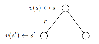 现在让我们考虑图9中的相反情况。二叉树的根现在是一个我们选择采取特定动作的状态。 请记住,马尔可夫过程是随机的。 采取行动并不意味着您将以100%的确定性结束您想要的目标。 严格地说,你必须考虑在采取行动后最终进入其他州的概率。 在采取行动后的这种特殊情况下,您可以最终处于两个不同的下一个状态s':