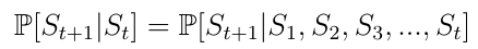 马尔可夫过程是描述一系列可能状态的随机模型,其中当前状态仅依赖于先前状态。 这也称为Markov Property(Eq.1)。 对于强化学习,这意味着AI主体的下一个状态仅取决于最后一个状态而不是之前的所有先前状态。
