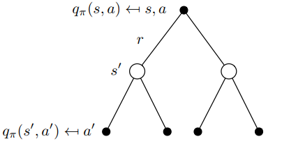 这种递归关系可以再次在二叉树中可视化(图10)。 我们从q(s,a)开始,以一定的概率Pss'结束于下一个状态s'从那里我们可以用概率 π 采取行动 a' 并且我们以动作值 q 结束(s', 一个')。 为了获得q(s,a),我们必须在树中上升并整合所有概率,如在 等式 18中可以看到的那样。