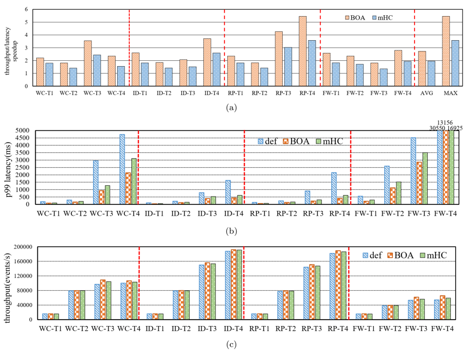 图三:所有程序 — WordCount (WC),Identity(ID),RePartition(RP)和FixWindow (FW)的性能比较 — 默认配置(DEF):贝叶斯优化算法(BOA)和改进的爬山法(MHC).