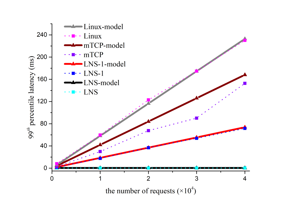 图二:瞬时突发请求的数量对所建模的三台服务器的99分位尾延迟的影响。“LNS”、“mTCP”和“Linux”代表延迟敏感请求的99分位尾延迟的测量值;“-model”后缀代表模型预测值;“-1”后缀代表全部的请求。