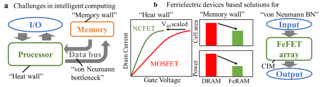 图五:(a)使用冯·诺伊曼架构的现代计算机面临的挑战 (b)基于铁电器件的“热墙”,”内存墙”和冯·诺伊曼瓶颈的解决方案示意图