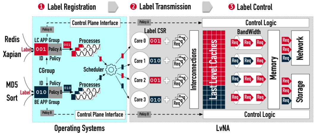 本文介绍了一种新的支持低熵云的计算机体系结构,称为标签化冯诺依曼体系结构 (LvNA, Labeled von Neumann Architecture),该架构在计算机系统内部集成了一套标签驱动的控制机制,能够在系统共享资源上实现区分、隔离、优先处理应用程序请求。利用标签化机制,LvNA能够在提高资源利用率的同时,保护特定应用 (如延迟敏感型应用)的性能不受无序资源竞争的影响。基于LvNA的设计,我们流片了一个1.2GHz 8核RISC-V处理器BEIHAI。实验结果表明,BEIHAI能够将内存带宽竞争导致的性能下降从82.8%大幅降低到0.4%。当CPU利用率提高70%以上时,BEIHAI可以将延迟敏感型应用Redis的99分位延迟从115 ms降低到18.1 ms。此外,BEIHAI还可以实现无需软件Hypervisor支持下,同时启动两个未修改的虚拟机。