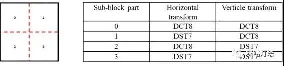 AVS3相比上一代编码标准,支持更加灵活的变换。针对超高清视频的编码中出现的大编码单元,采用最大为64x64的DCT变换。AVS3也支持二次变换,对使用帧内预测方式进行编码的块,考虑到其残差的特殊统计特性,通过对左上角4x4块的系数进行二次变换,进一步减少了编码冗余,使得变换系数进一步集中。此外,AVS3提出了基于位置的变换技术PBT。PBT考虑编码单元中不同位置的预测残差特性,将一个变换单元四叉树划分为四个单元,对行变换和列变换分别使用DCT8、DST7两种变换核,进一步提升了变换编码的效率,如下图为四个子块的行列变换绑定方式,这种基于位置的绑定方式能有效地适应不同位置帧间残差的分布规律,提升了变换的性能且具有较低的复杂度。