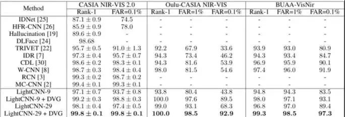 我们在CASIA NIR-VIS 2.0、Oulu-CASIA NIR-VIS和BUAA-VisNir三个NIR-VIS数据库上验证对偶生成模型的有效性。图2显示出我们生成的高质量虚拟数据具有丰富的类内多样性,如姿态表情等。表1的量化结果显示,使用生成的虚拟数据后,识别性能大幅度提升(‘+DVG’表示使用生成的虚拟数据)。例如在Oulu-CASIA NIR-VIS数据库上,VR@FAR=0.1%提升了24.6%(DVG 92.9% - LightCNN-29 68.3%)。我们的方法在三个NIR-VIS数据库上都取得了当前最好的识别性能。