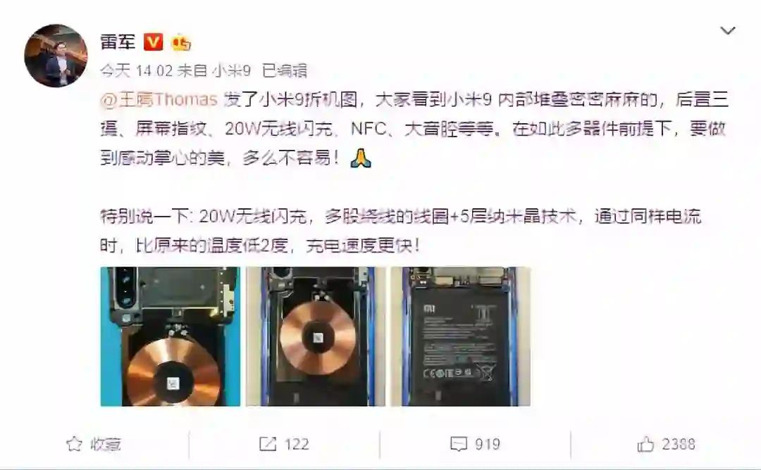 随后,小米创始人兼CEO雷军发微博感慨道:“@王腾Thomas发了小米9拆机图,大家看到小米9内部堆叠密密麻麻的,后置三摄、屏幕指纹、20W无线闪充、NFC、大音腔等等。在如此多器件前提下,要做到感动掌心的美,多么不容易!”